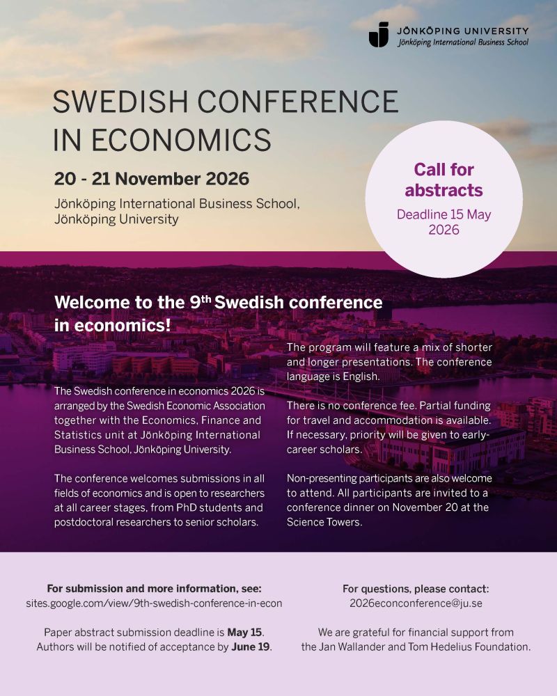 Den 9 Nationalekonomiska konferensen äger rum den 20–21 november 2026 vid Jönköping International Business School (JIBS). Konferensen arrangeras i samarbete mellan Nationalekonomiska föreningen och JIBS och samlar forskare inom nationalekonomi från hela Sverige.Syftet med konferensen är att skapa en mötesplats för att presentera och diskutera aktuell forskning inom nationalekonomi. Programmet omfattar presentationer av vetenskapliga arbeten […]