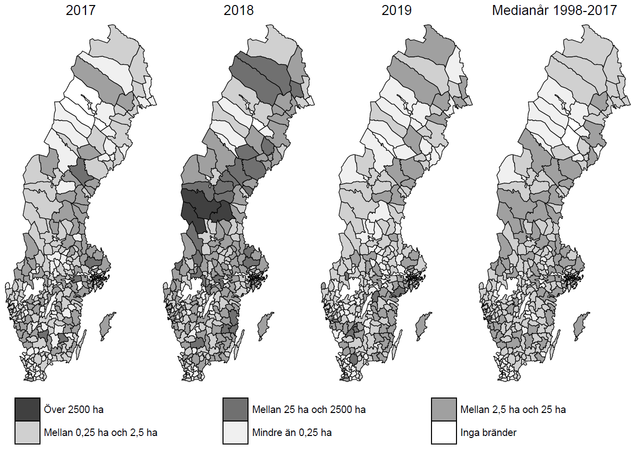Figur 1 illustrerar händelsernas omfattning. Kartorna över brandyta visar en kraftig ökning av brandytor under 2018 jämfört med året före (2017), året efter (2019) samt medianåret under perioden 2011–17 (beräknat på kommunnivån). Skillnaden framträder tydligt: 2018 sticker ut som ett extremt år.
