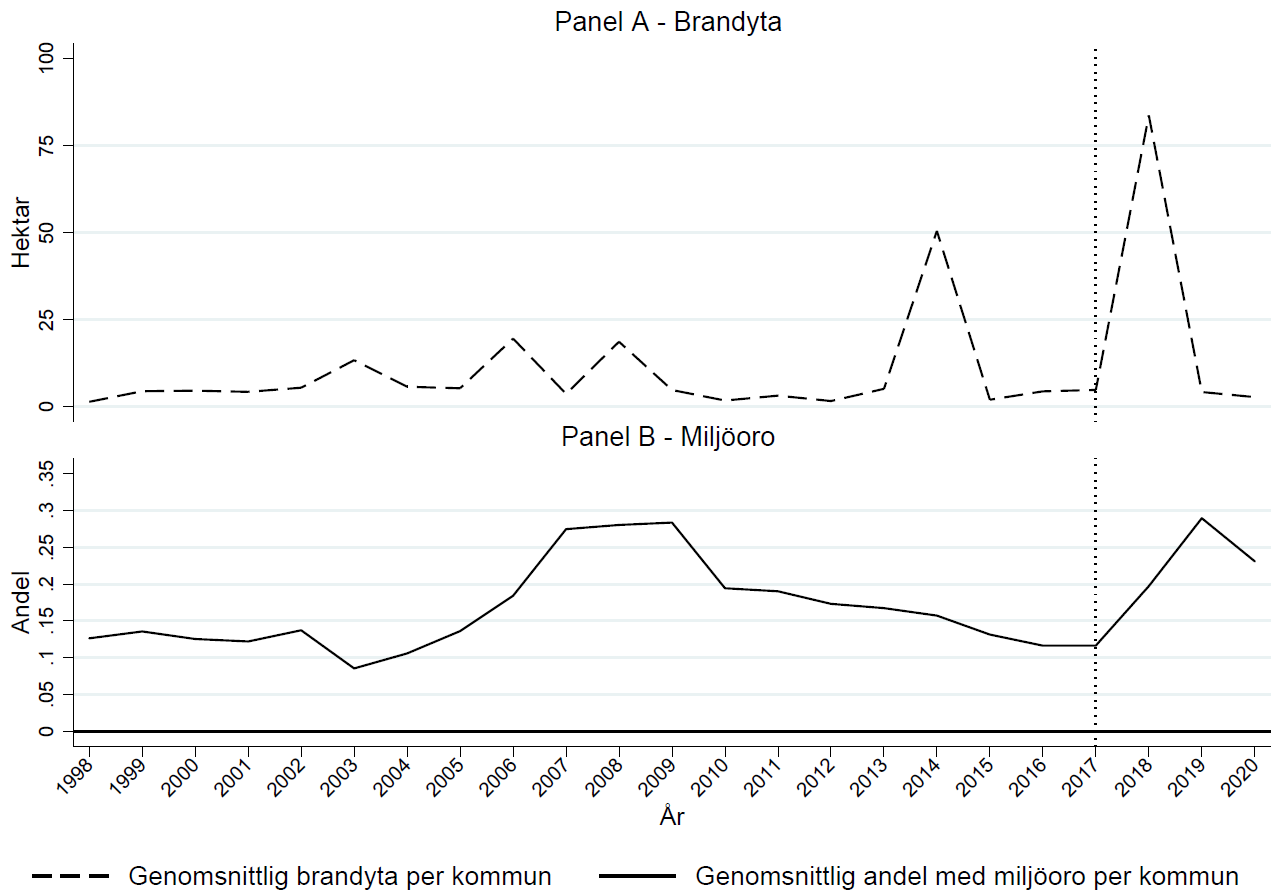 Panel A i figur 2 visar den kraftiga ökningen i brandaktivitet och brandyta under 2018. Panel B visar samtidigt ett tydligt trendbrott i opinionen. Efter nästan tio år av gradvis minskande miljöoro ökade andelen som angav miljöfrågor som ett av de viktigaste samhällsproblemen från 11,6 procent till 19,7 procent mellan 2017 och 2018.