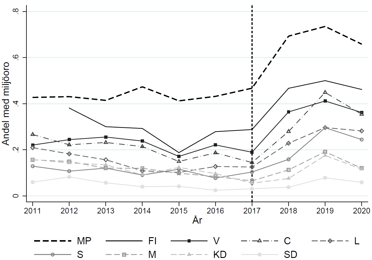Figur 3. Miljöoro över tid bland sympatisörer till olika politiska partier