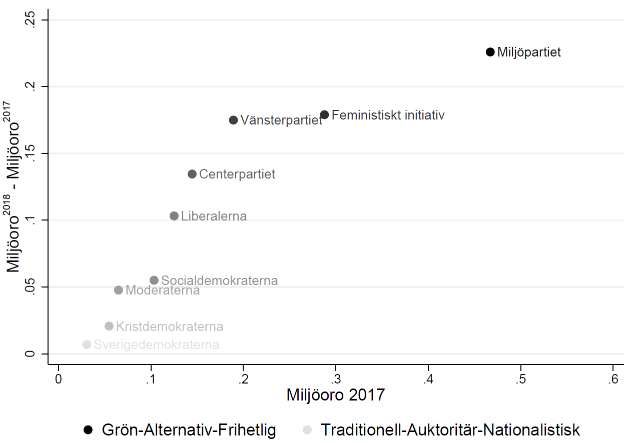 Figur 5 illustrerar hur bränderna påverkade miljöattityder för varje parti separat relativt effekten för Sverigedemokraterna. Analysen använder data för perioden 2011–18. Sverigedemokraterna kan här ses som en kontrollgrupp, eftersom deras miljöoro var i stort sett oförändrad över tid. Sex av åtta skattade partikoefficienter för miljöoro är positiva och statistiskt signifikanta. Resultaten visar en tydlig ideologisk gradient: partierna är ordnade från mest liberala (MP) till mest konservativa (KD) enligt GAL–TAN-skalan, och effekterna avtar successivt längs denna dimension.