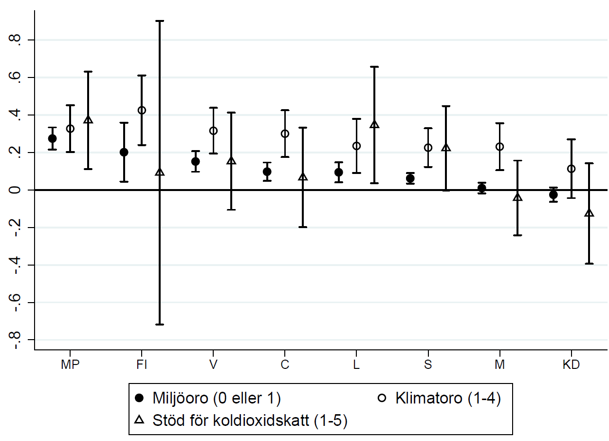 Anm: Sverigedemokraterna används som kontrollgrupp då deras anhängare inte uppvisar någon attitydförändring efter bränderna. Punktestimat presenteras med omgivande 95-procentigt konfidensintervall. Enligt partiernas positioner på GAL–TAN-skalan kan de svenska partierna ordnas från mest liberala (GAL) till mest konservativa (TAN) enligt följande: Miljöpartiet (MP), Feministiskt initiativ (FI), Vänsterpartiet (V), Centerpartiet (C), Liberalerna (L), Socialdemokraterna (S), Moderaterna (M), Kristdemokraterna (KD) och Sverigedemokraterna (SD). Miljöoro är en indikatorvariabel, medan övriga utfallsvariabler mäts på en fyr- respektive femgradig skala.