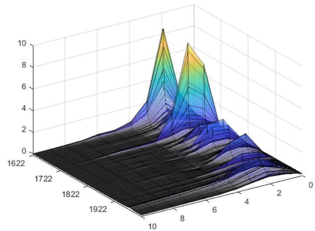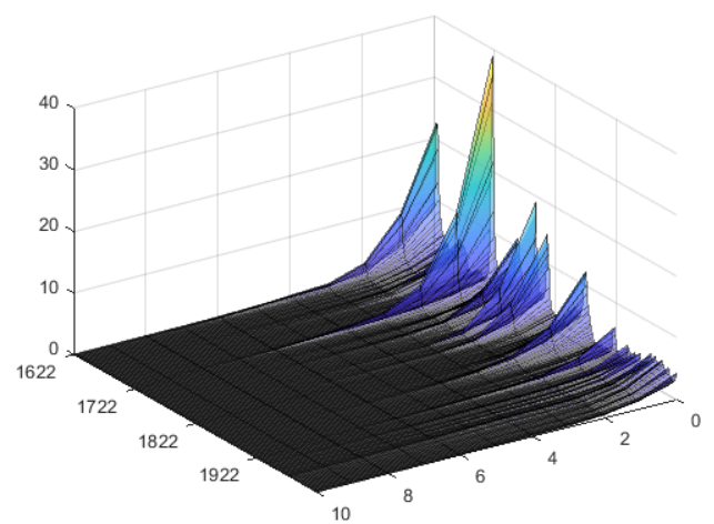 Hur ser då dynamiken ut i den föredragna modellen? Detta illustreras enklast genom modellens impuls-respons-funktioner, vilka beskriver den effekt som en störning till en variabel har på variablerna i systemet.8 I figur 2 visas effekten som en störning till penningmängdstillväxten av storleken en standardavvikelse har på penningmängdstillväxten. Noteras bör att denna standardavvikelse varierar över tiden eftersom modellen har stokastisk volatilitet. Storleken på störningen framgår av effekten på horisont noll. Som framgår av figuren har volatiliteten varit väldigt hög vid ett antal tillfällen – inte sällan i samband med krig. Mellan 1620 och 1624 tredubblades penningmängden i samband med att kopparmynt som innehöll mindre koppar än det nominella värdet präglades. Penningmängden femdubblades nästan mellan 1714 och 1718, bl a på grund av att s k nödmynt präglades. Och penningmängden fördubblades 1808 till 1809 i samband med att Riksbankssedlar inte längre kunde växlas in mot silver. Noteras kan dock att även om störningarna var mest volatila på 1710-talet så var effekterna på penningmängdstillväxten av dem mest långlivade på 1970-talet.