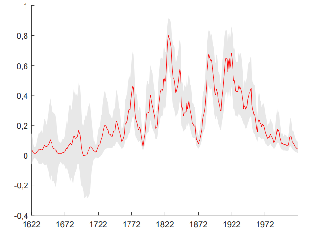 Av figuren framgår att det typiskt sett är en positiv korrelation mellan residualerna. Korrelationens storlek varierar; från 1622 till mitten på 1700-talet och i slutet på den studerade perioden är korrelationen låg. Relativt höga värden – större än 0,6 – återfinns på 1820-talet, i slutet av 1800-talet och i samband med första världskriget. Några kausala slutsatser kan inte dras utifrån detta, men vi noterar att en positiv korrelation är konsistent med att hög penningmängdstillväxt genererar hög inflation samma år. Å andra sidan är en positiv korrelation naturligtvis också konsistent med att hög inflation genererar hög penningmängdstillväxt samma år. Vår sammanfattande slutsats blir således att penningmängdstillväxten sannolikt påverkar inflationen – åtminstone kontemporärt – men att vår out-of-sample-analys ifrågasätter huruvida penningmängdstillväxten kan prognostisera inflationen.