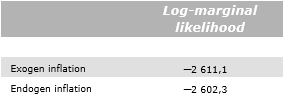 Vi skattar inledningsvis modeller med konstanta och tidsvarierande parametrar där inflationen är endogen. Resultaten återfinns i tabell 1 och visar att modellen med tidsvarierande parametrar har högst marginal likelihood. Stödet för denna modell är, med Kass och Rafterys (1995) terminologi, ”mycket starkt” då två gånger skillnaden i log-marginal likelihood är 103,6.7