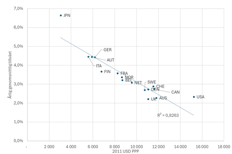 Grupper av länder som upplever konvergens kännetecknas av att det finns ett tydligt negativt samband mellan inkomstnivån i början av en period och tillväxttakten under perioden. De länder som Jonung jämför Sverige med tillhör en sådan konvergensklubb. Innan vi fortsätter ska vi dock konstatera att Solows teori inte förklarar vad som gör att många av världens länder inte tillhör klubben. För detta krävs teorier som betonar faktorer som utbildning, forskning (Romer 1990; Lucas 1988) och institutionella förutsättningar – exempelvis äganderätt, en inkluderande stat och ett förutsägbart rättssystem (North 1991; Acemoglu m fl 2004).