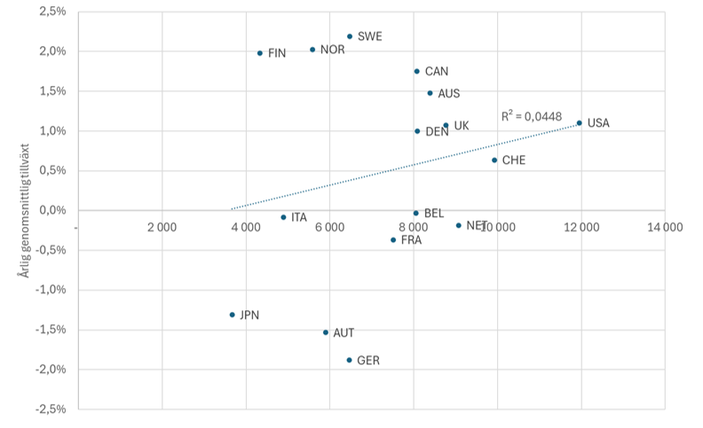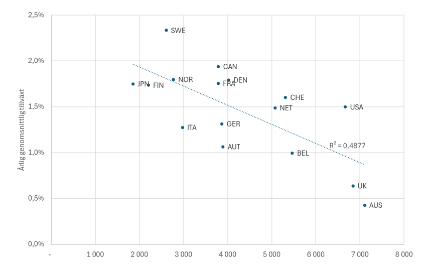 Därmed kan vi studera sambandet mellan inkomstnivå 1950 och genomsnittlig årlig tillväxt fram till 1979. Figur 2 med data från The Maddison Project Database visar att Sverige hade ett solitt medlemskap i konvergensklubben, med en tillväxttakt som följer det generella mönstret. Det finns alltså inget behov av att förklara några svenska särdrag.