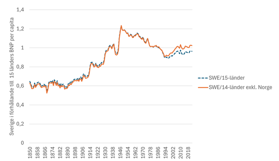 Figur 1. Sveriges BNP per capita i relation till genomsnittet för BNP per capita för femton jämförbara industrialiserade länder 1850–2020. Den streckande linjen motsvarar samma grupp förutom Norge