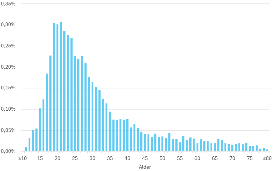 I slutet av föregående decennium blossade det upp en debatt om att unga personer med könsdysfori hade ökat kraftigt. Våra data, där vi identifierat alla i svenska patientregister med en könsdysforidiagnos 1973–2020, bekräftar en tydlig ökning, främst bland unga under 2010-talet (Kolk m fl 2025). Mellan 2010 och 2020 ökade andelen av befolkningen som fått en könsdysforidiagnos från 0,02 till 0,07 procent. Trots denna ökning var det fortfarande en mycket liten grupp, totalt ca 7 500 personer år 2020. Även om andelen är högre bland personer i unga åldrar, är den fortfarande mycket låg. Figur 1 visar andelen personer som har fått diagnosen könsdysfori fram t o m år 2020 inom olika åldersgrupper. Den största andelen finns i ålderskategorierna runt 20 år där omkring 0,3 procent har fått en könsdysforidiagnos. Liknande siffror återfinns i flera andra länder i västvärlden, exempelvis i USA (Zhang m fl 2020). Vi vet däremot inte om förändringen beror på att fler personer har könsdysfori eller att fler söker vård. För att sätta utvecklingen i en historisk kontext ger vi nedan en överblick av hur regelverket har sett ut för att få könsbekräftande vård och byta juridiskt kön i Sverige.