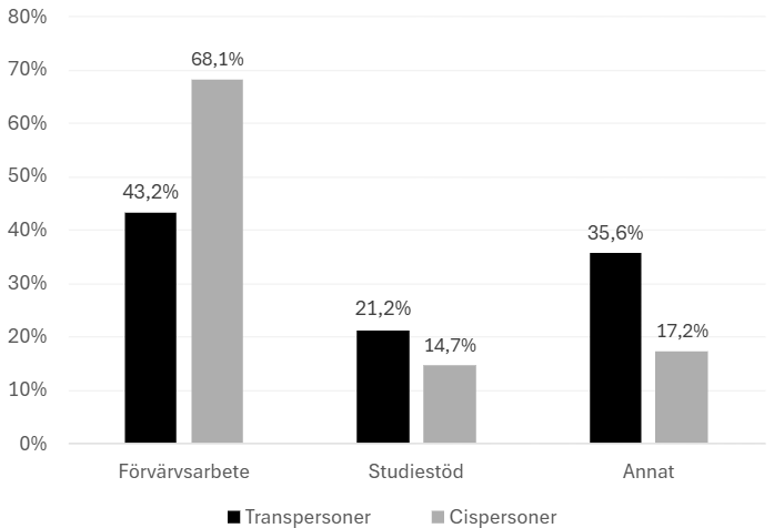 Figur 3. Andel (i procent) med huvudinkomst från förvärvsarbete, studiestöd och annat för transpersoner och åldersmatchade cispersoner, 15–65 år, 2020